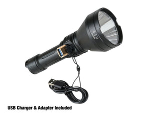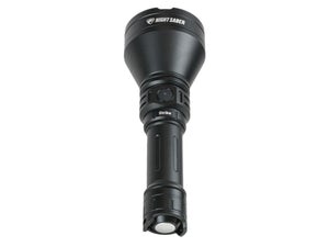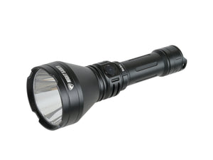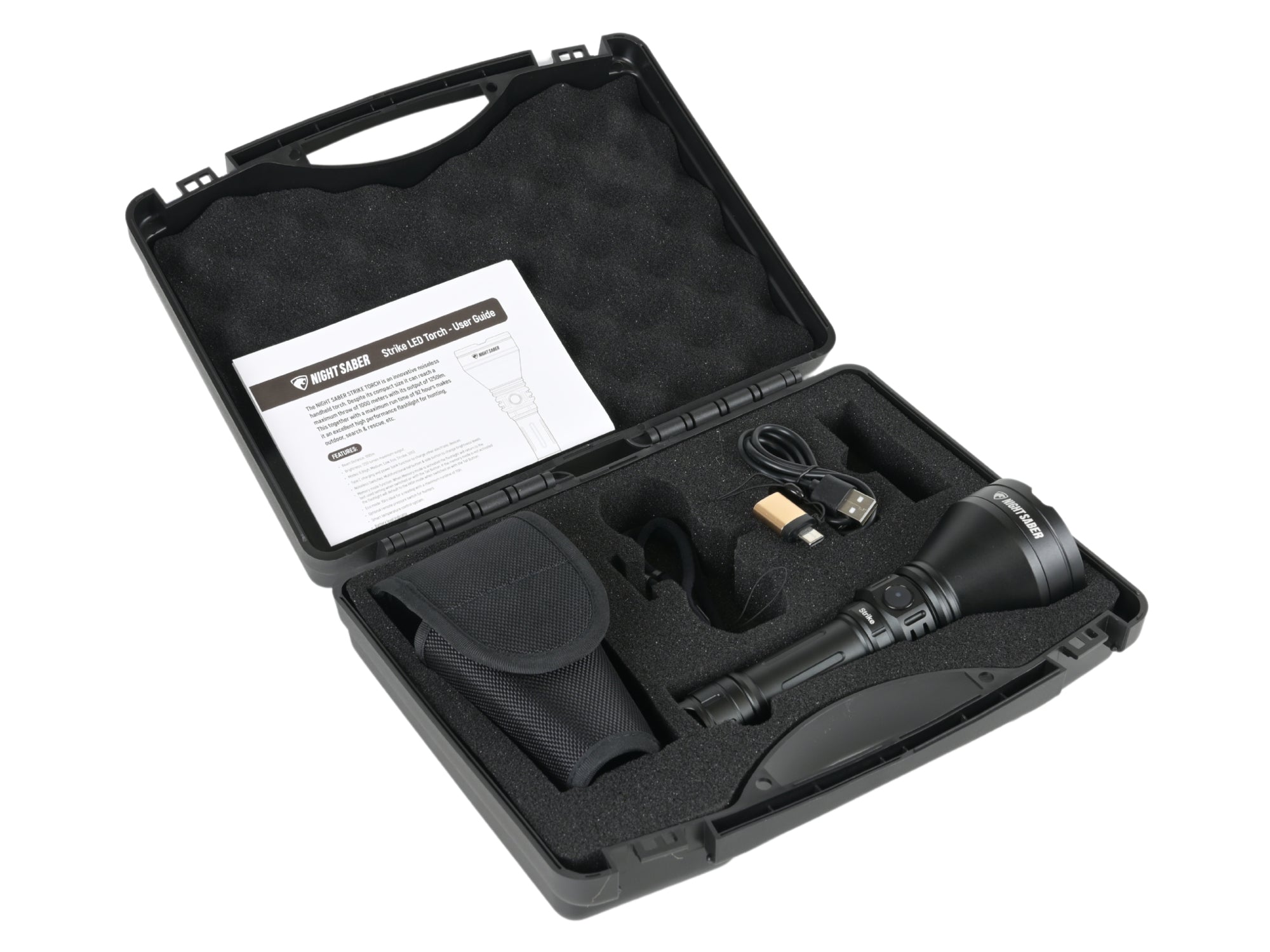The Night Saber STRIKE torch is an innovative noiseless handheld torch. Despite it's compact size it can reach a maximum beam throw of 1000 meters with it's output of 1250 lumens. This together with a maximum run time of 113 hours (on low) makes it an excellent high performance flashlight for hunting, search & rescue ect. The night Saber STRIKE compact torch is a competitive alternative to O-light, Walther or LED Lenser range torches.