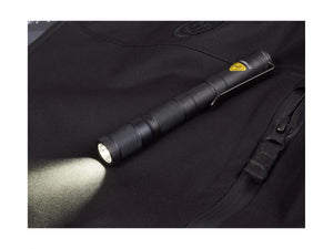 The compact PFA1 in pen format is ideal as a handy illumination of the work surface or similar in the chest pocket. close range. The light intensity memory ensures that the PFA1 always starts at the level it was last used. On/off and the brightness switch (2/25/100 lumens) is simple and easy via the rear switch. The sturdy stainless steel clip allows comfortable carrying. The solid aluminium housing is hard-anodised and waterproof according to IPX8. The PFA1 is equipped with two standard cells in AAA format (1.5 V micro or 1.2 V battery). Supplied with batteries and replacement gasket.